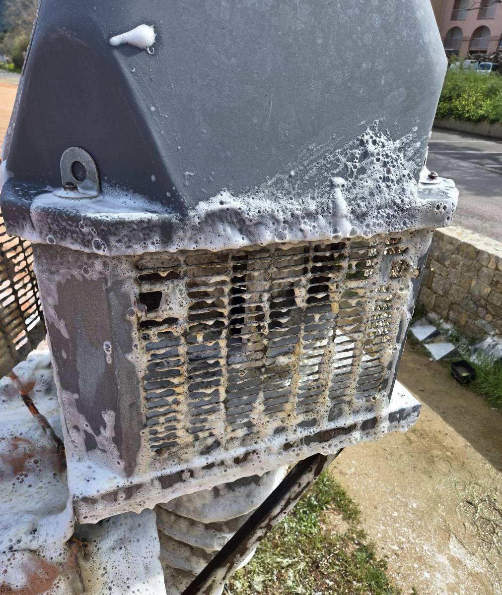 Application de dégraissant professionnel : un produit moussant a été pulvérisé sur l’ensemble de la structure, notamment les grilles, la turbine et les parois.