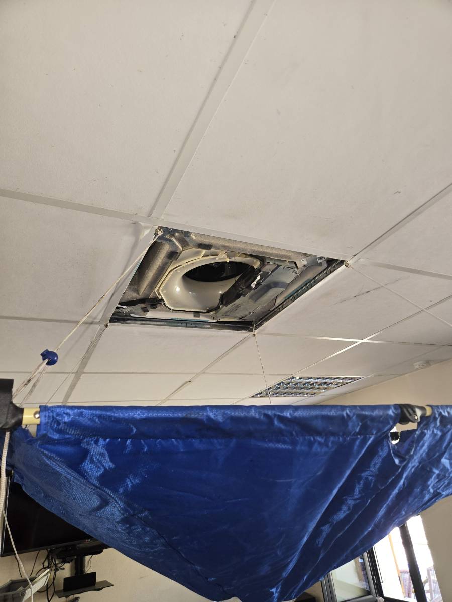 Légères fuites d'eau détectées, ce qui a nécessité l'installation d’une bâche de protection temporaire pour éviter tout dégât sur le mobilier du bar.