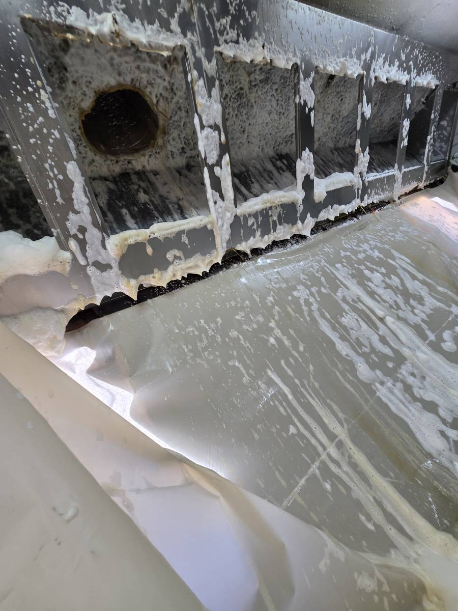 Application de produits dégraissants professionnels : pulvérisation d’une mousse active sur l’ensemble du réseau d’extraction (filtres, caisson, conduits).